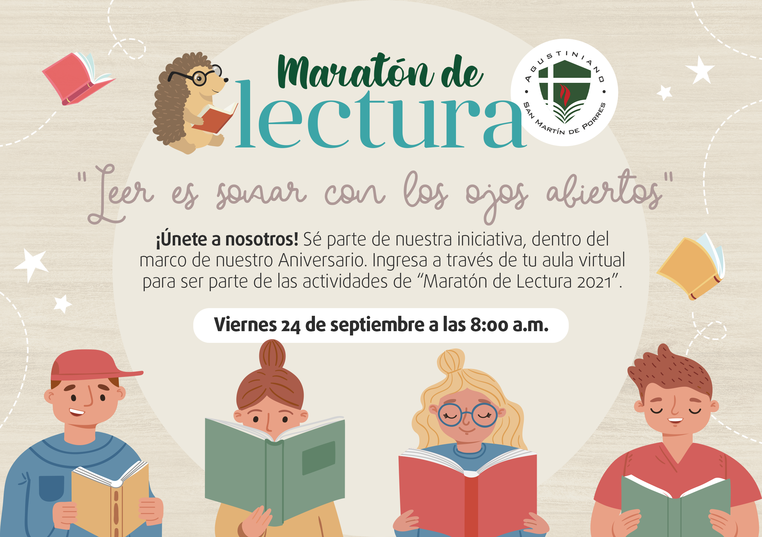 La lectura es parte esencial de nuestra vida y despierta en nosotros la creatividad, aumenta la comprensión, atención, observación, concentración, reflexión / pensamiento crítico y la memoria. ¿Ves cuánto nos ayuda? Por ello, queremos invitar a nuestros estudiantes este próximo Viernes 14 de septiembre a las 8:00 a.m. a participar de nuestra MARATÓN DE LECTURA 2021; para que puedan compartir un momento enriquecedor a través de la lectura. El ingreso ese día será a través de sus aulas virtuales. ¡Los esperamos!
